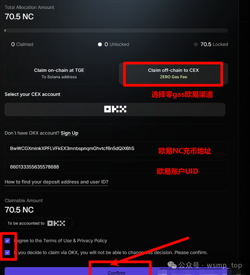选择领取到CEX,目前仅支持OKEX,。填写nc充币地址和Uid,选这个无gas费。