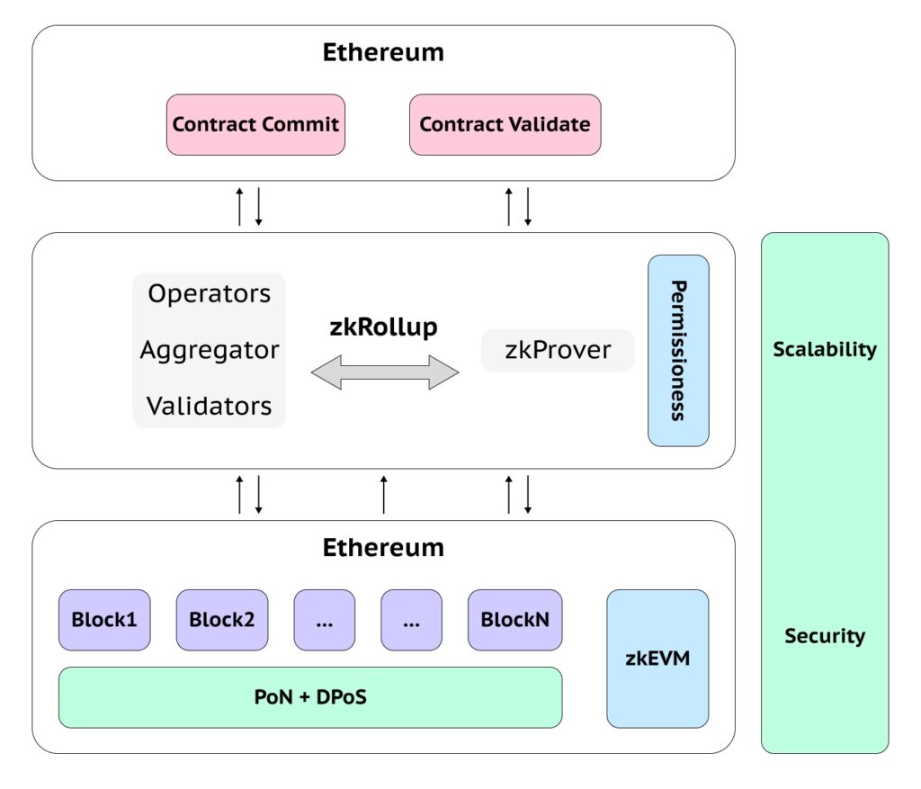 - L2本身就是AVIVE,兼容zkEVM,运行在PoN+DPoS共识算法下。L2 上的每个区块都由网络参与者挖掘和验证。