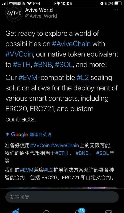 Avive World原生代币VVCoin 价值相当于ETH、BNB、SOL等公链币