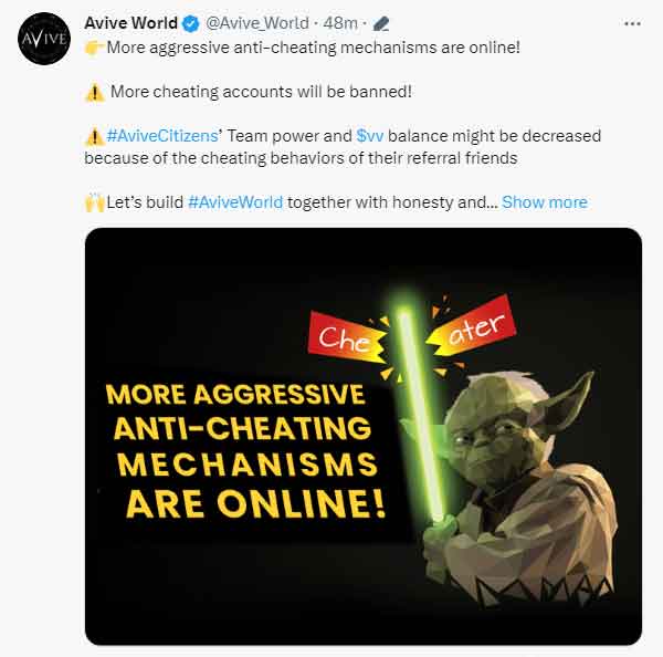 AviveCitizens的团队力量和vv余额可能会因为他们推荐朋友的作弊行为而减少