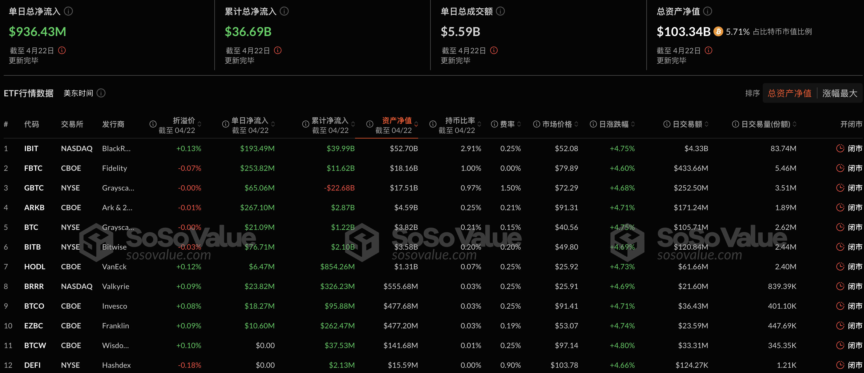 报道 4月23日消息,根据 SoSoValue 数据,昨日(美东时间 4 月 22 日)比特币现货 ETF 总净流入 9.36 亿美元。