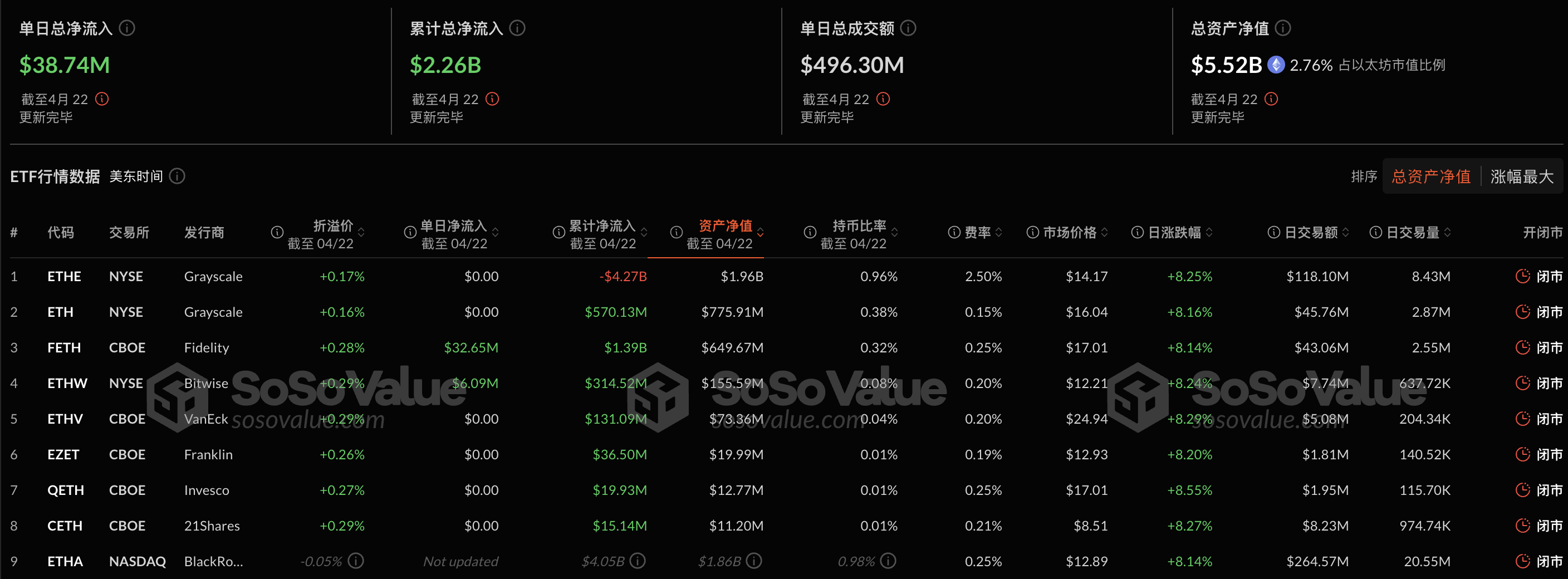 报道 4月23日消息,根据 SoSoValue 数据,昨日(美东时间 4 月 22 日)以太坊现货 ETF 总净流入 3874.06 万美元。